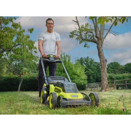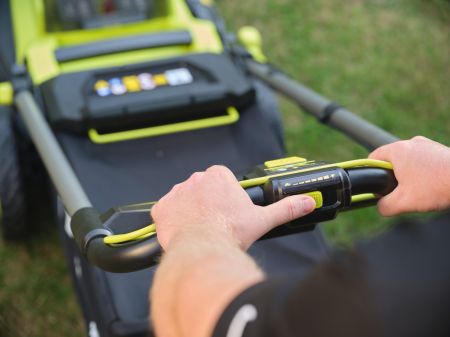 Srdcem sekačky je moderní bezkartáčový motor využívající elektronické řízení výkonu. Oproti klasickým uhlíkovým motorům poskytuje vyšší účinnost, nižší zahřívání a delší provozní životnost. Motor zároveň automaticky optimalizuje výkon podle hustoty a výšky trávy, což pomáhá efektivně využívat energii akumulátoru a zajišťuje stabilní výsledky sečení i v náročnějších podmínkách. Model RY18LMXSP51A-0 je vybaven vlastním pojezdem, který výrazně snižuje fyzickou námahu při práci. Pohon kol usnadňuje manipulaci zejména při sečení ve svahu, na členitém pozemku nebo při delší práci na větších zahradách. Ergonomicky řešená rukojeť podporuje pohodlné vedení stroje a lepší kontrolu nad směrem jízdy.