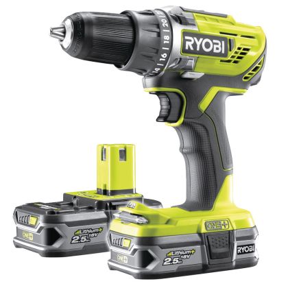 Aku kompaktní vrtací šroubovák RYOBI R18DD3-225S ONE+ , Li-ion 18 V / 2 x 2.5 Ah, otáčky 0-500/0-1800 min-1, kroutící moment 50 Nm, sklíčidlo 13 mm, hmotnost 1,3 kg.