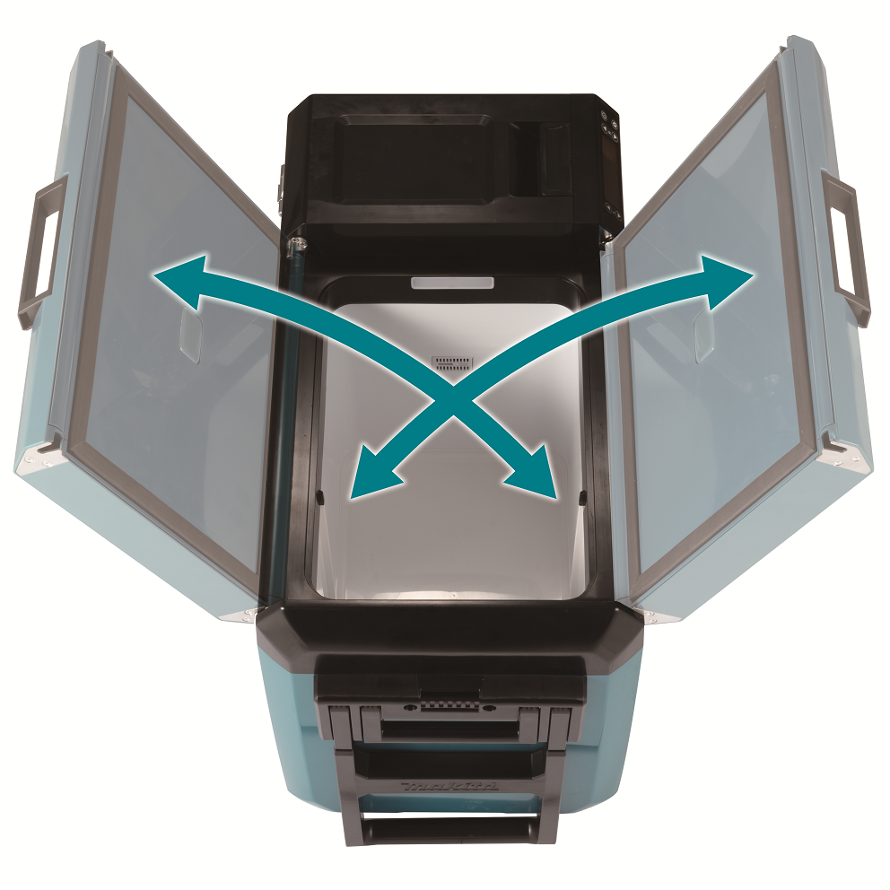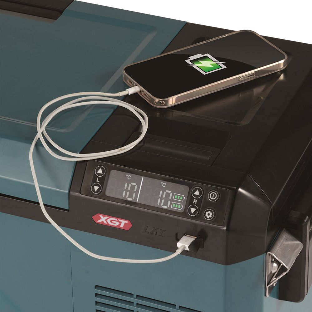 Šikovný pomocník na cestách fungující na 2 akumulátory Li-ion XGT 40V, na 2 akumulátory Li-ion LXT18V, síťový adaptér nebo autokonektor 12V.