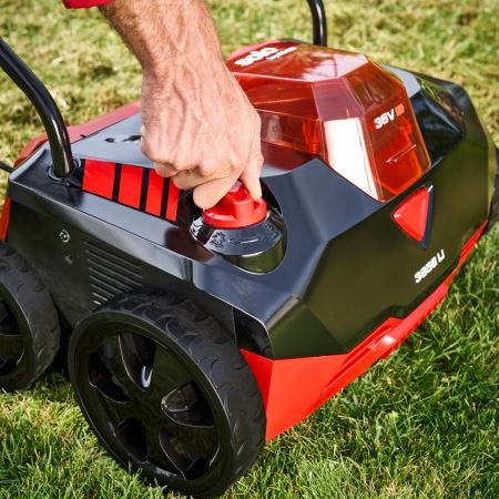 Díky bateriovému napájení můžete na zahradě pracovat tiše a bez výfukových plynů. S pracovní šířkou 38 cm zajišťuje kompaktní konstrukce vertikutátoru pohodlný provoz a jednonápravová konstrukce umožňuje snadné manévrování v rozích a kolem překážek. Hloubku vertikutačního válce lze centrálně a plynule nastavit (+6 až -14 mm).
