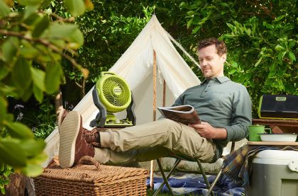 Akumulátorový ventilátor ideální pro vnitřní i venkovní použití, kompaktní a přenosný s vestavěnou rukojetí.