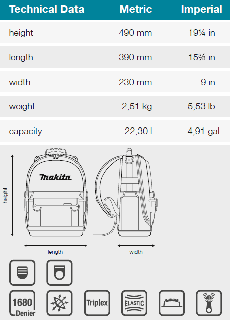 Batoh s organizérem MAKITA E-15481, objem 22,3 l, rozměry 490 x 390 x 230 mm, hmotnost 2,5 kg.