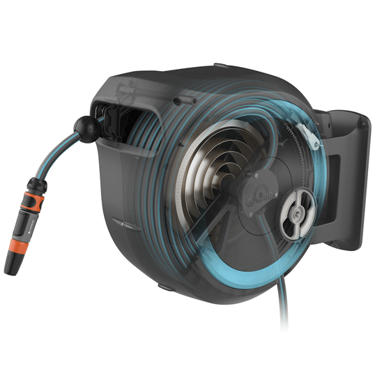 RollControl: lehkým zatažením za konec hadice se aktivuje integrovaná ocelová pružina, která hadici automaticky a spolehlivě navine. Technologie RollControl zajišťuje pomalé a bezpečné navíjení bez ohledu na to, jaká dlouhá je odvinutá hadice.