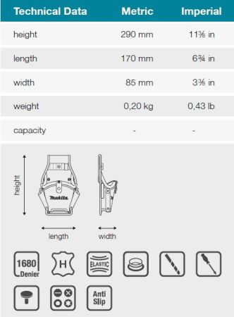 Brašna na aku vrtačku MAKITA, rozměry 170 x 85 x 290 mm, hmotnost 0,20 kg.