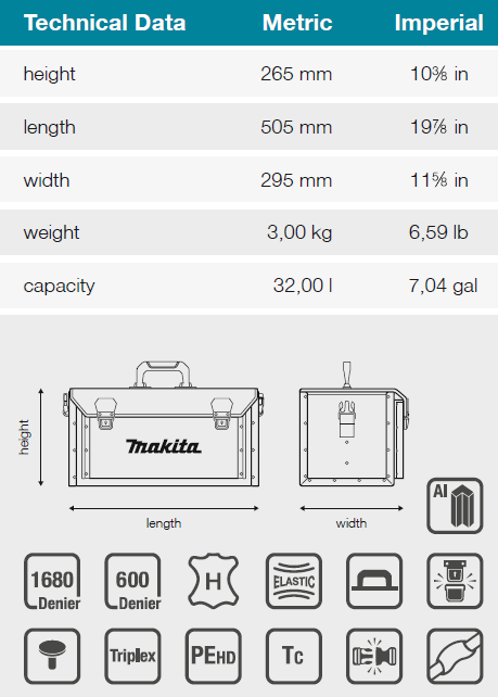 Brašna na nářadí MAKITA E-15394, objem 32 l, rozměry 505 x 295 x 265 mm, hmotnost 3 kg.