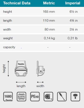 Brašna na pásku MAKITA, rozměry 110 x 80 x 165 mm, hmotnost 0,14 kg.
