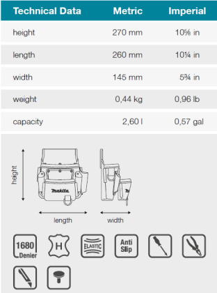 Brašna se dvěma přihrádkami MAKITA E-15198, objem 2,6 l, rozměry 260 x 145 x 270 mm, hmotnost 0,44 kg.