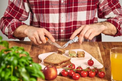 Cestovní příbor STIHL , nůž a vidlička, nerezová ocel s oranžovými plastovými rukojeťmi ze skelného vlákna.