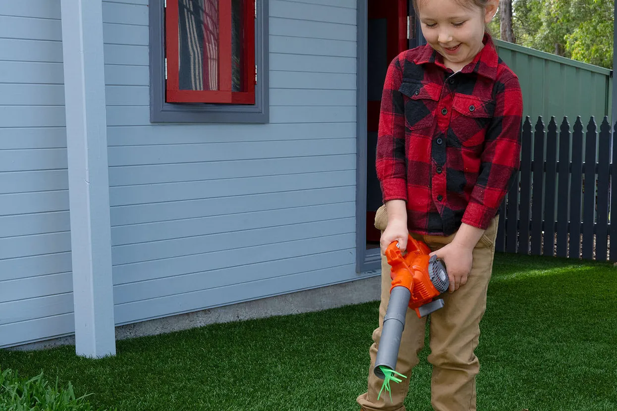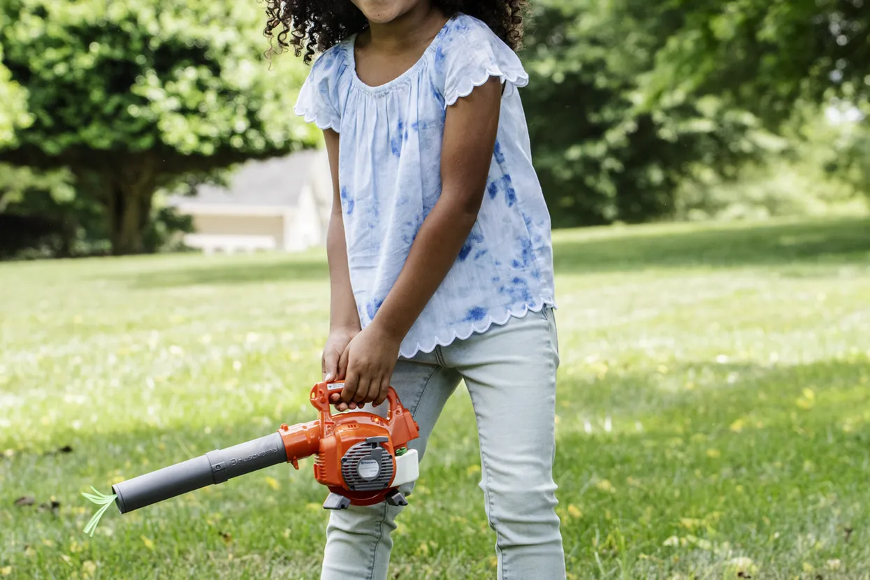 Dětský foukač HUSQVARNA, vypadá jako skutečný foukač HUSQVARNA 125B. Při stlačení spouště vydává autentický zvuk a fouká vzduch z trysky. Zelené fáborky na konci trubice „ukazují“ foukání vzduchu. Po nastartování se rozsvítí světla. Vhodné pro děti od 3 let.