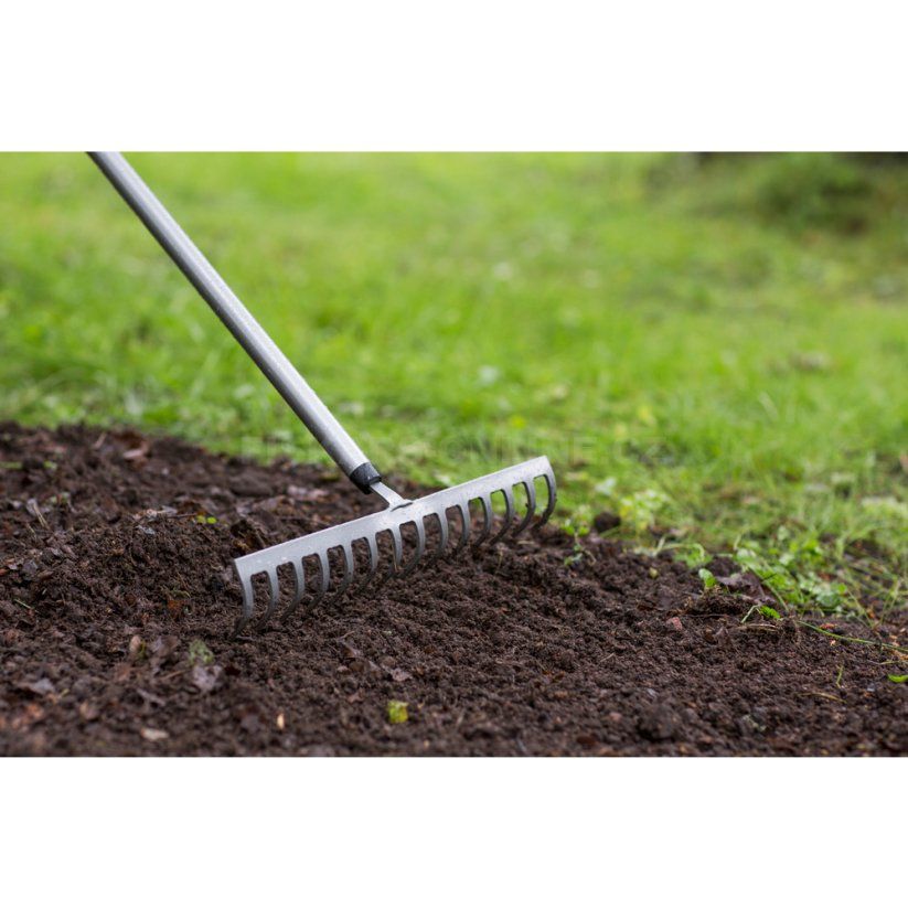 Lehké zahradní hrábě na úpravu povrchu záhonů nebo pro hrabání větviček a mulče.