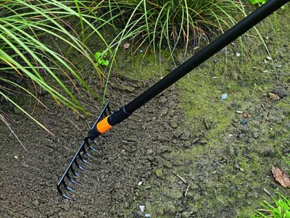 Praktické hrábě FISKARS QuikFit pro úpravu záhonů. Používají se s násadami QuikFit™, mající unikátní automatický dvojitý zamykací systém - vítěz ocenění Red Dot Award.