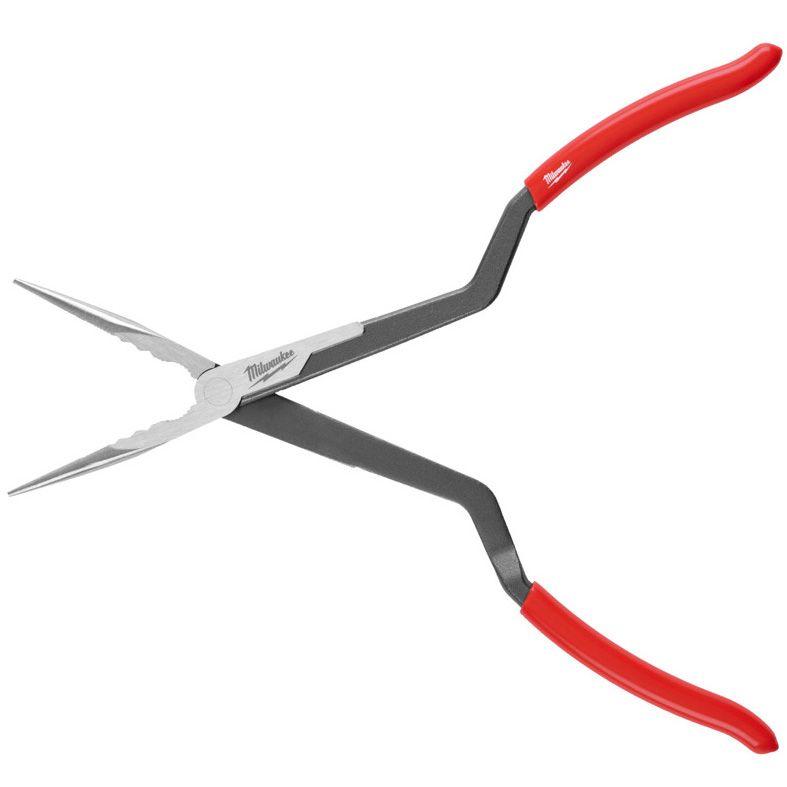 Dlouhé kleště MILWAUKEE , zahnuté 45°, délka 326 mm, s křížovými rukojeťmi a jedním kloubem pro lepší uchopení.
