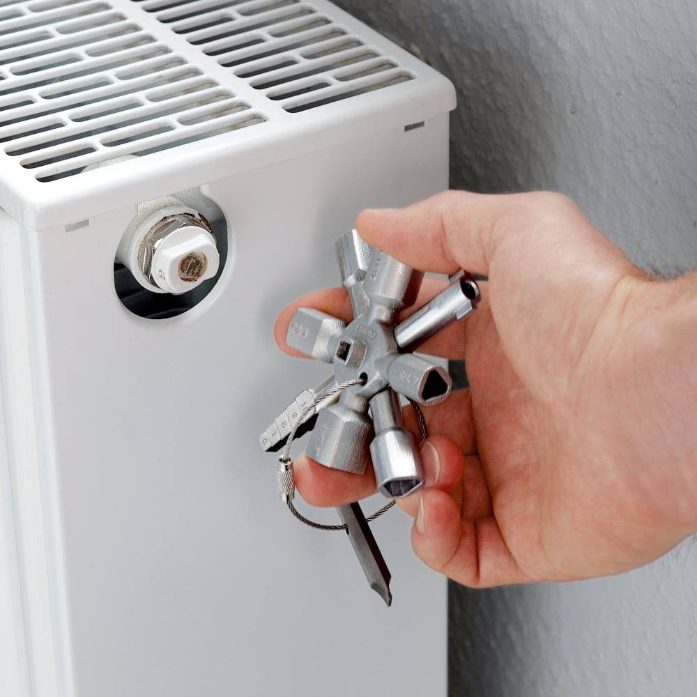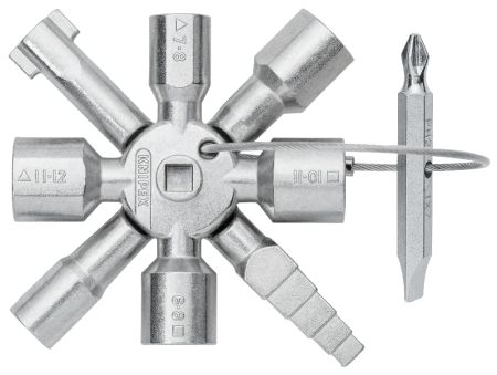 Multifunkční klíč pro ovládání uzávěrů z oblasti techniky budov (topení a sanitární zařízení, klimatizační a větrací technika, elektrotechnika), zásobování plynem a vodou a uzavíracích systémů.
