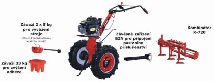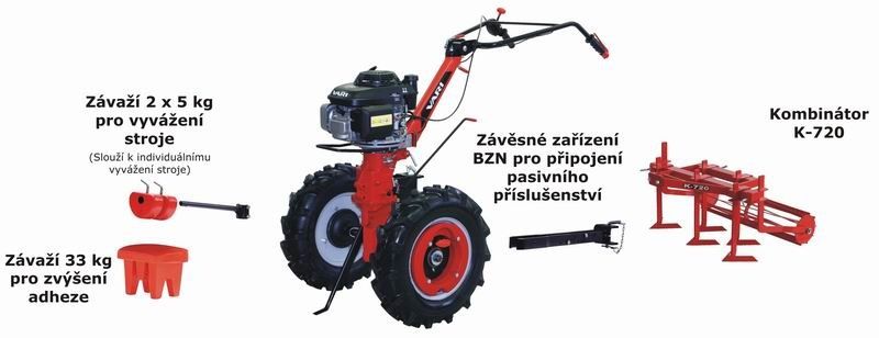 Kombinátor K-720 se skládá z hlavního rámu, ke kterému se pomocí třmenů zajištěných šrouby připojuje pět nastavitelných radliček. Prutový válec je zasazen čepy v kluzných ložiscích a je zajištěn třmenovými kroužky. Kombinátor se připojuje přímo do závěsného zařízení BZN, k vymezení vůle (6-8 mm) slouží dvojice šroubů s maticemi. Šíře záběru K-720 je max. 720 cm, hmotnost 30 kg a prac. hloubka max. 5 cm.