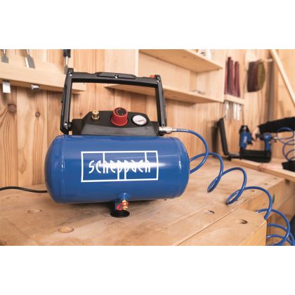 Kompresor SCHEPPACH HC 06 je praktický, lehký a snadno přenosný kompresor s tlakovou nádobou o objemu 6 l a silným motorem 1200 W. Díky moderní bezolejové technologii má minimální nároky na údržbu. Hodí se jak do běžných domácích dílen, tak i pro řemeslníky, pro které je důležitým kritériem nízká váha, malá hmotnost a snadný transport. Díky vzdušníku se kompresor hodí nejenom na běžné nafukování pneumatik, míčů, matrací, jízdních kol, ale můžete k němu připojit i sponkovačku, stříkací pistoli (air brush), ofukovací pistoli apod. Díky bezolejové technologii je vhodný i na tlakování výčepních zařízení. Výši tlaku si jednoduše nastavíte otočným ovladačem a jednoduše kontrolujete pomocí vestavěného manometru. Stroj je vybaven velkým madlem, háky pro snadné namotání přípojného kabelu a pro dobrou stabilitu i nohami s gumovými patkami. Kompresor je už v základu vybaven bohatou sadou šestidílného příslušenství, takže ho můžete bez dalších finančních výdajů začít ihned používat. Nástroje šestidílné sady jsou vyrobeny z kvalitních slitin kovů a snadno se připojí na rychlospojku kompresoru.