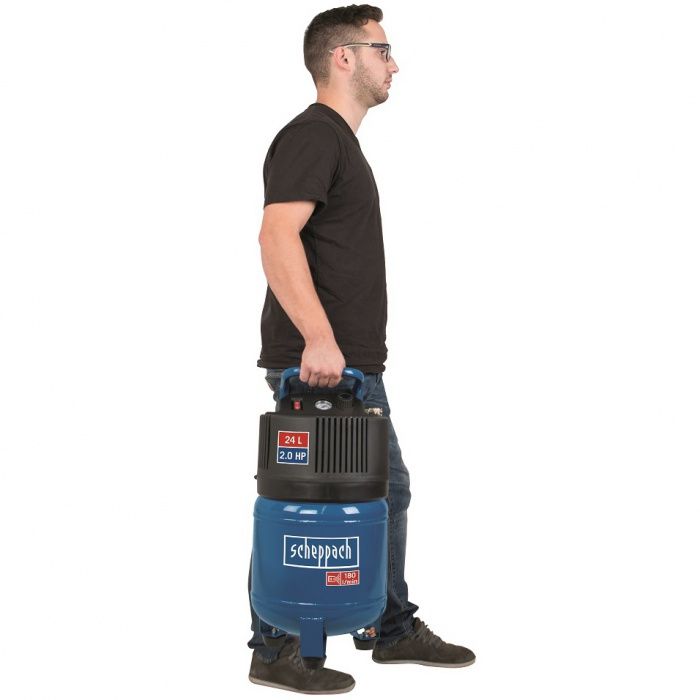 Vertikální kompresor SCHEPPACH HC 24 V je prostorově velmi úsporný stroj, který má díky použití moderního motoru s bezolejovou technologií rovněž minimální nároky na údržbu. To ho staví do role ideálního kompresoru pro běžné domácí využití a do stísněných dílen a garáží. Tlaková nádoba slouží jako zásobárna stlačeného vzduchu a motor se tak zapíná jen v případě, že tlak vzduchu klesne pod požadovanou úroveň. Díky vzdušníku můžete s kompresorem provádět i náročnější operace, než je běžné huštění. Můžete k němu připojit třeba sponkovačku, stříkací pistoli (airbrush), ofukovací pistoli a další vzduchové nářadí. Při dofukování pneumatik zase oceníte jednoduché nastavení výše tlaku, který můžete snadno kontrolovat pomocí vestavěného manometru. Díky bezolejové technologii se dobře hodí i k udržování tlaku v pivních sudech. Přídavná rukojeť, nízká hmotnost a kompaktní rozměry umožní snadnou manipulaci se strojem.