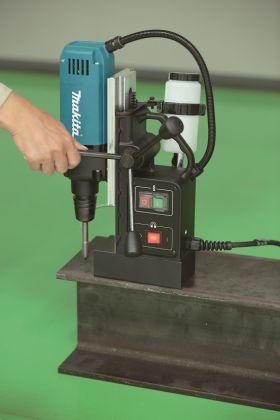 Magnetická vrtačka MAKITA HB350 , příkon 1050 W, otáčky 850/min , max. průměr frézy 35 mm, upínání Weldon 19 nn, síla 8000 N, hmotnost 11,5 kg.