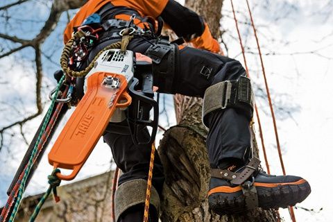 Výklopný hák: slouží k bezpečnému zavěšení pily při výškových pracích v korunách stromů.