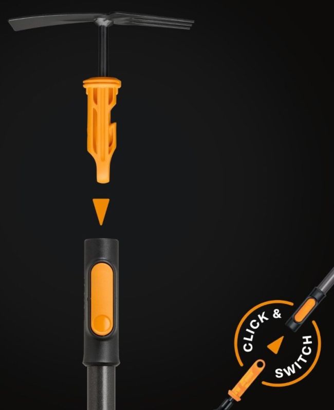Motyčka je kompatibilní se systémem OneClick a vybavena automatickým a bezpečným uzamčením. Mechanismus zajišťuje rychlé a pevné připojení k násadě bez viklání během práce a stabilní přenos síly při záběru do půdy.