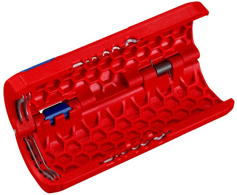 Nástroj pro řezání vlnitých trubek KNIPEX TwistCut 902202SB , s odizolovacími čepelemi, délka 100 mm, pro vlnité plastové trubky se šířkou vlny až 2,7 mm, hmotnost 47 g.