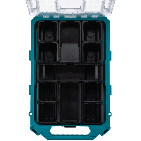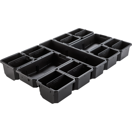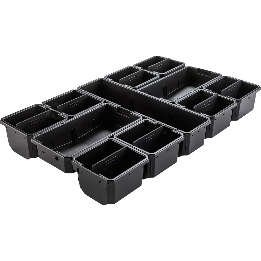Má různé velikosti zásobníků pro uspořádání malých i velkých dílů, s nízkoprofilovým designem pro organizaci malých dílů.