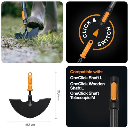 Nůž na okraje trávníku FISKARS OneClick  je určen pro precizní zarovnání hran trávníku u záhonů, chodníků, obrubníků nebo jiných pevných ploch.