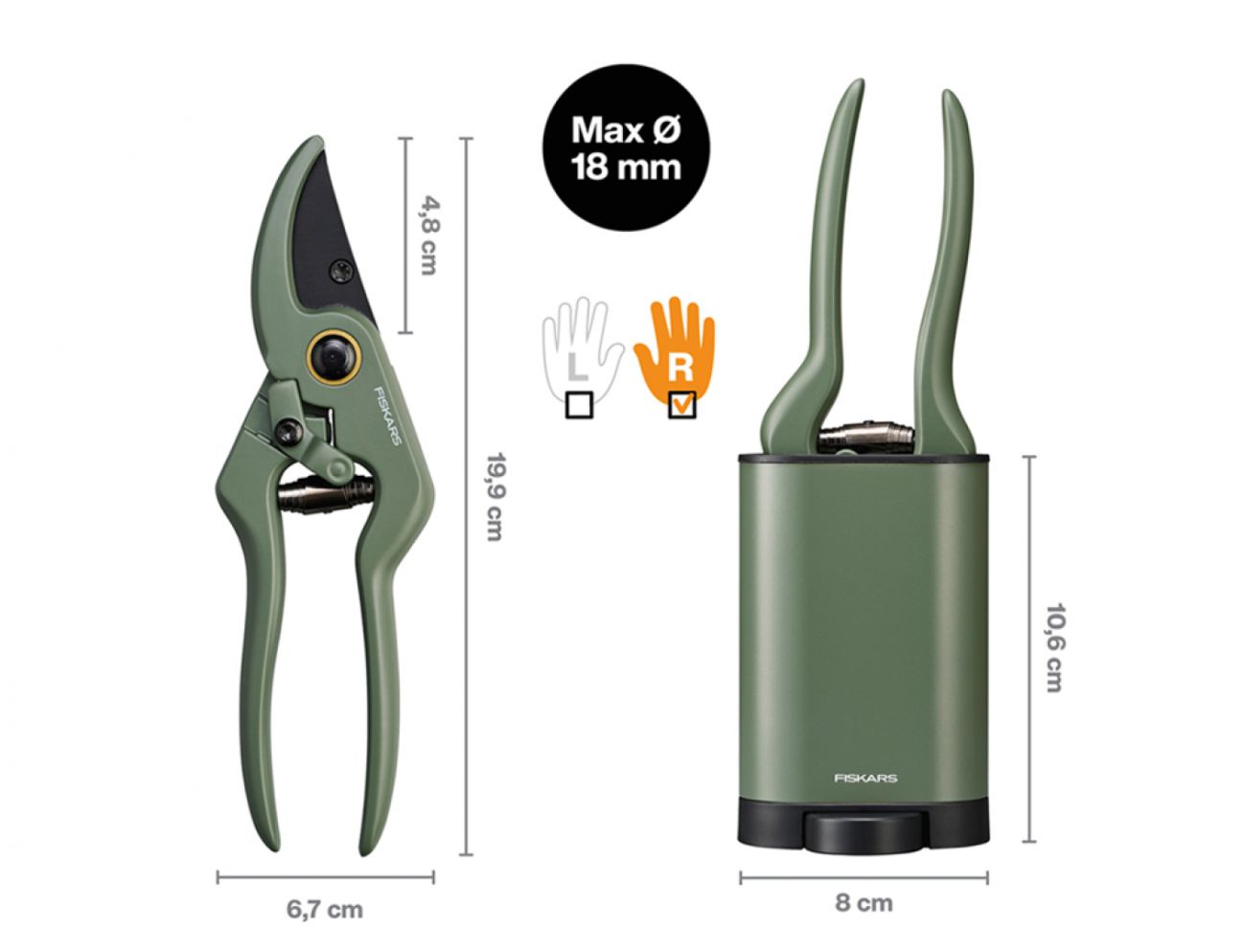 Dvoučepelové provedení nůžek umožňuje čisté řezy větví, stonků a kořenů až do průměru 18 mm.