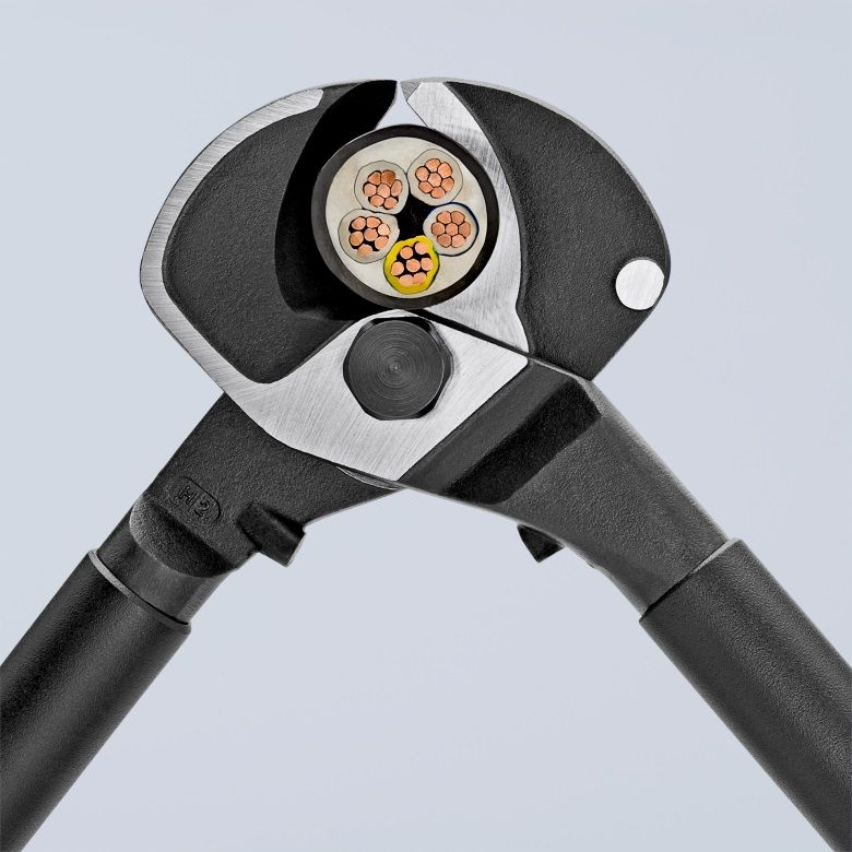 Kabelové nůžky  KNIPEX 9512500 , délka 50 cm, brunýrované, rukojeti s vícesložkovými návleky, pro střihání měděných a hliníkových kabelů, jednožilových a vícežilových, hmotnost 1090 g.