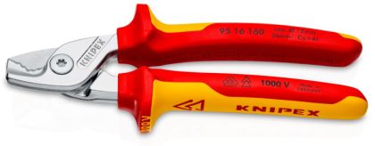 Kabelové nůžky KNIPEX StepCut 9516160 , délka 16 cm, chromované, rukojeti izolované vícesložkovými návleky, pro měděné a hliníkové kabely s průměrem až 15 mm, certifikace VDE, hmotnost 225 g.