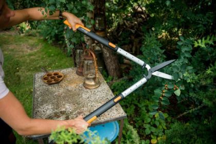 Nůžky FISKARS SmartFit HS86 s pohodlnými teleskopickými držadly pro větší dosah střihu.