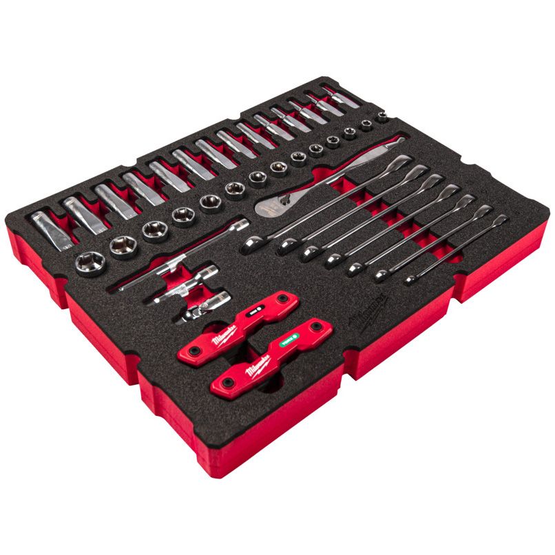 Pěnová vložka se sadou ráčny, nástrčných klíčů a ráčnových klíčů  MILWAUKEE PACKOUT , 55 ks, určeno do zásuvek skladovacího systému MILWAUKEE PACKOUT.