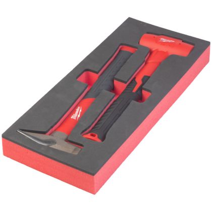 Sada zámečnického kladiva a paličky v pěnové vložce MILWAUKEE, 2 ks, určeno pro dílenské vozíky a skříně MILWAUKEE. Obsahuje zámečnické kladivo se sklolaminátovou násadou 500 g a paličku bez zpětného rázu 790 g.