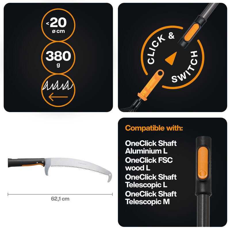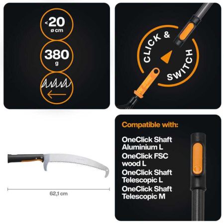 Pilu lze používat jako klasickou ruční pilu nebo ji připojit k násadě systému OneClick pro práci ve výškách bez nutnosti použití žebříku. Automatický zámek OneClick umožňuje rychlé, pevné a bezpečné uchycení k kompatibilní násadě bez viklání během práce.