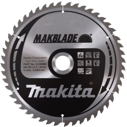 Komplexní výběr pilových kotoučů MAKITA MAKBLADE pro všechny značky a modely pokosových pil a ponorných pil včetně aku provedení. Bohatý výběr velikostí od 190–305 mm a počtu zubů od 24 do 100 pokrývá možnosti použití od rubých řezů až po práci se zvlášť jemnou povrchovou úpravou. Tvrzené a vyztužené kotouče absorbují rázy a zůstávají ploché a rovné. Úzká řezná spára s menším množstvím odpadu.