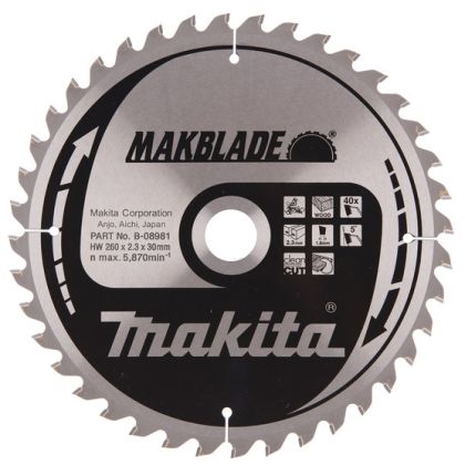 Komplexní výběr pilových kotoučů MAKITA MAKBLADE pro všechny značky a modely pokosových pil a ponorných pil včetně aku provedení. Bohatý výběr velikostí od 190–305 mm a počtu zubů od 24 do 100 pokrývá možnosti použití od rubých řezů až po práci se zvlášť jemnou povrchovou úpravou. Tvrzené a vyztužené kotouče absorbují rázy a zůstávají ploché a rovné. Úzká řezná spára s menším množstvím odpadu.