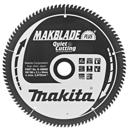 Pilové kotouče MAKITA MAKBLADE PLUS pro pokosové a stolní pily mají jedinečné patentovanou technologii. Tyto kotouče jsou vyvinuty k pohlcení vibrací a velmi tichému chodu. Mají vlastnosti zlepšovat pracovní prostředí, životnost kotouče a spolehlivost celého zařízení. Kotouč s menšími vibracemi zajistí přesnější vedení řezu a také snižuje házivost. Výsledným efektem je ideální řezná plocha. Také má za důsledek významně delší životnost zubů z karbidu wolframu překračující životnost konvenčních pilových kotoučů s karbidovými hroty. Přesně vyztužené kotouče s plochým ostřím a rovnějším řezem. Povrchová vrstva s velmi malým třením znamená řezání bez námahy a ochranu před korozí.