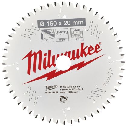 Řezný kotouč pro okružní pily  MILWAUKEE CSB P Alu , průměr kotouče 160 mm, průměr hřídele 20 mm, 52 zubů.
