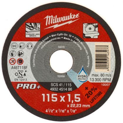 Řezný kotouč na kov MILWAUKEE SCS 41 PRO+ , Ø kotouče 115 mm, tloušťka 1,5 mm, Ø hřídele 22,2 mm. Pro řezání všech druhů oceli.