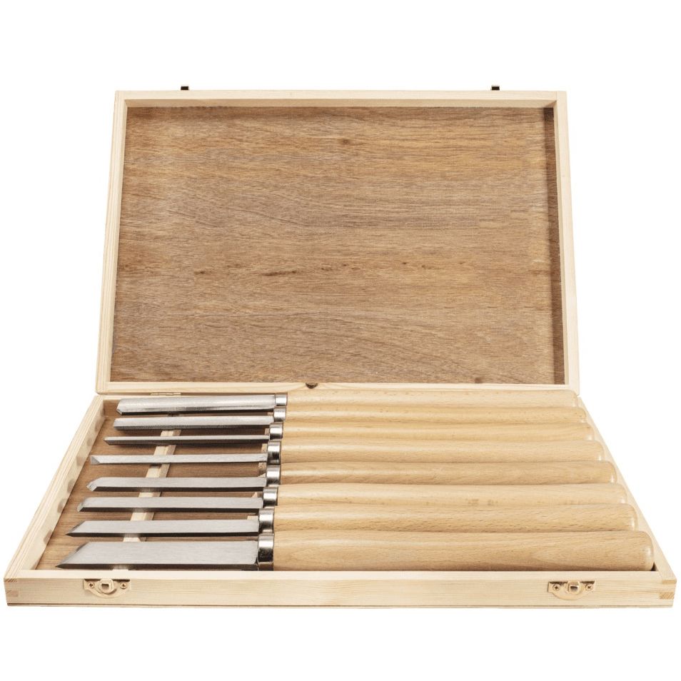 Sada 8 ks různých soustružnických dlát SCHEPPACH v dřevěném boxu.