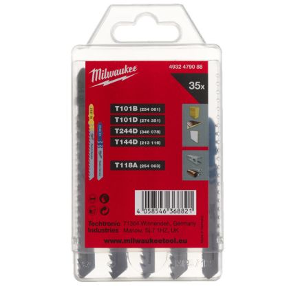 Sada pilových plátků MILWAUKEE s "T" stopkou, balení 35 ks, pro přímočaré pily. Použití do dřeva a kovu.
