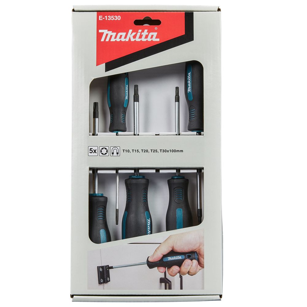Sada 5 ks Torx šroubováků MAKITA E-13530. Šroubováky mají magnetický hrot a protiskluzovou rukojeť s praktickým označením velikosti na zadní straně.