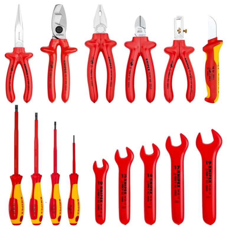 Sada obsahuje kombinované kleště Knipex 0307200 (200 mm), boční štípací kleště Knipex 7007160 (160 mm), odizolovací kleště Knipex 1107160 (160 mm), půkulaté kleště s břity Knipex 2617200 (200 mm), otevřený klíč Knipex 980010, otevřený klíč Knipex 980013, otevřený klíč Knipex 980014, otevřený klíč Knipex 980017, otevřený klíč Knipex 980019, šroubovák Knipex 982025, šroubovák Knipex 982040, šroubovák Knipex 982055, šroubovák Knipex 982065, kabelový nůž Knipex 9852 a kabelové nůžky Knipex 9517200 (200 mm) v odolné svinovací tašce.