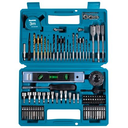 Bity 1/4 '' 25 mm: 2 × PZ1, 3 × PZ2, 2 × PZ3, PH1, PH2, PH3 T10, T15, T20, T25, T27, T30, HEX3, HEX4, HEX5, HEX6, 2 × SL0 0,5 × 3,0, 2 × SL0,5 × 4,0, 2 × SL0,6 × 4,5, 2 × 1,0 × 6,0, SL1,2 × 7,0, SL1,2 × 8,0, bity 1/4 '' 50 mm: PZ0, PZ1, 2 × PZ2, PZ3, PH1, 2 × PH2, PH3, T10, T20, T25, T27, HEX3, HEX4, HEX5, HEX6, SL0,5 × 3,0, SL0,5 × 4,0, SL0,6 × 4,5, 1/4 '' nástavec pro sádrokarton 30 mm, Magnetický držák 1/4 '' 60 mm, 1/4 "nástrčné klíče 38 mm: 2 × 5, 5,5, 2 × 6, 2 × 7, 8, 9, 10, 11, 12, 13 mm, Omezovače hloubky: 3, 5, 8, 10 mm, Šestihranný klíč 2,5 mm, důlčík adaptér 1/4 '' 36 mm, Vrtáky do dřeva válcové: 60 × 3, 75 × 4, 85 × 5, 92 × 5,5, 92 × 6, 100 × 6,5 mm, HSS- vrtáky do kovu válcové: 61 × 3, 75 × 4, 86 × 5, 93 × 5,5, 93 × 6, 101 × 6,5 mm, Vrtáky do zdiva válcové: 60 × 3, 75 × 4, 85 × 5, 85 × 5,5, 100 × 6, 100 × 6,5 mm, Ploché bity 1/4 "150 mm: 12, 16, 19 mm, Korunky: 32, 38, 45, 54 mm, Adaptér pro korunky 1/4 "šestihranný / válcový, prodloužení vodováha 229 mm, Svinovací metr 3 m.