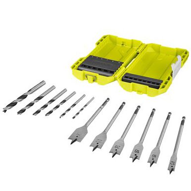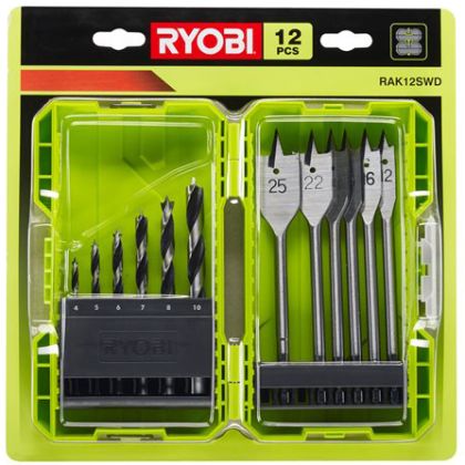 Sada vrtáků do dřeva RYOBI RAK12SWD , 12 ks - 6x plochý vrták + 6x vrták se středícím trnem.