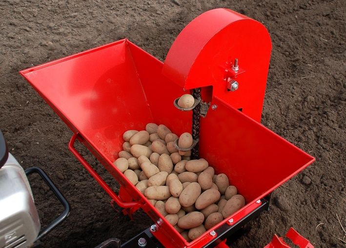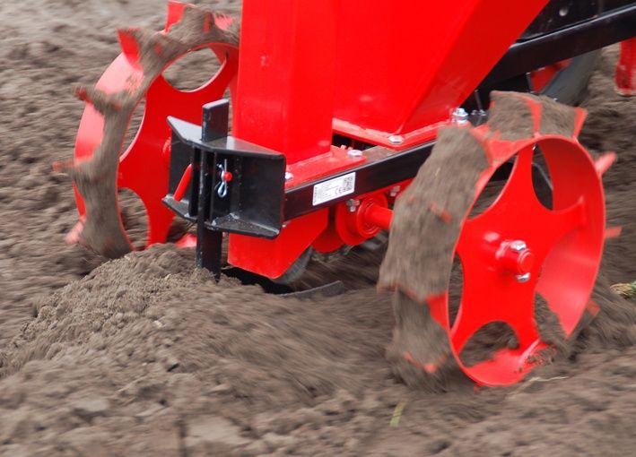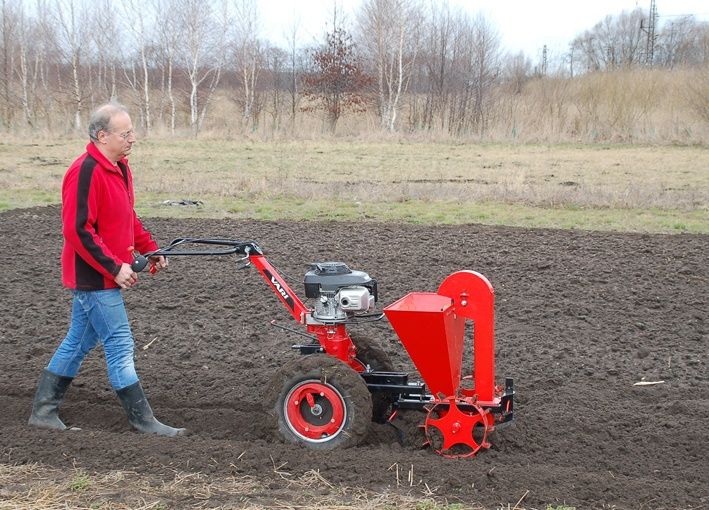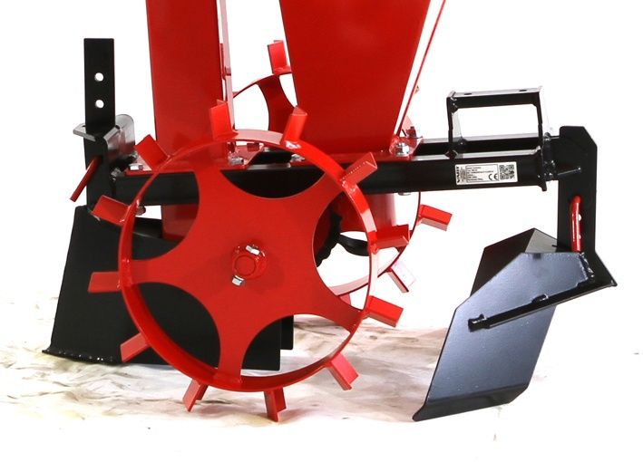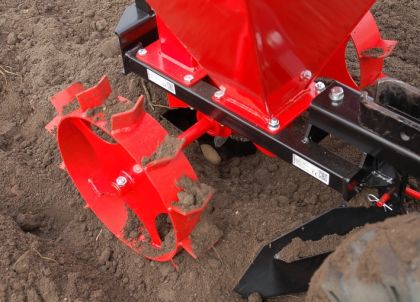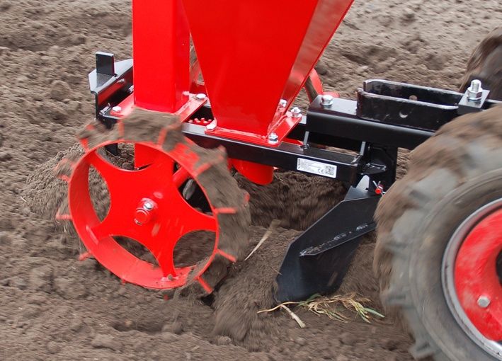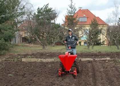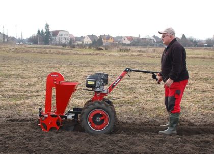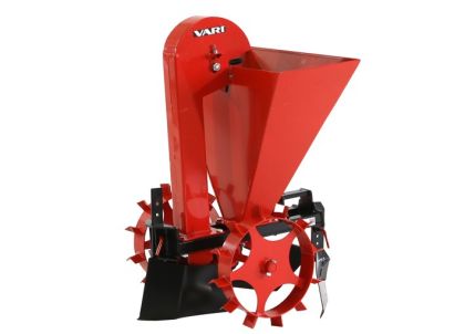 Sazeč brambor VARI SB-40, vpředu nesený automatický jednořádkový sazeč brambor SB-40 s miskovým mechanismem a se zásobníkem na 20 kg sadby.