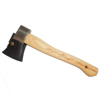 Ručně kovaná kempingová sekera  KRUMPHOLZ , s koženým pouzdrem, hmotnost 500 g, násada z dřeva hickory, délka 36 cm, vhodná na přenášení v batohu.