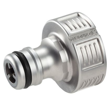Šroubení GARDENA Premium ve velmi kvalitním kovovém provedení umožňuje bezpečné připojení zahradní hadice k vodovodnímu kohoutku. Manipulace je velmi snadná a pohodlná díky speciálně tvarovanému tělesu šroubení. Jeho extrémně dlouhá životnost je daná tím, že je vyrobené z pevného kovu. Šroubení lze připojit na vodovodní kohoutky se závitem 26,5 mm (G 3/4").