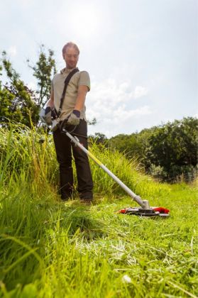 Výhodou této strunové sekačky je snadno vyměnitelné žací ústrojí - volitelně buďto strunová hlava se záběrem 35 cm pro běžné vyžínání, nebo ocelový nůž se záběrem 23 cm do ztížených podmínek. Tím můžete bez problémů obhospodařovat domácí zahradu, stejně jako náročný a neudržovaný terén. Díky systému Tipp-Automatik snadno nastavíte optimální délku struny poklepem strunové hlavy o zem.