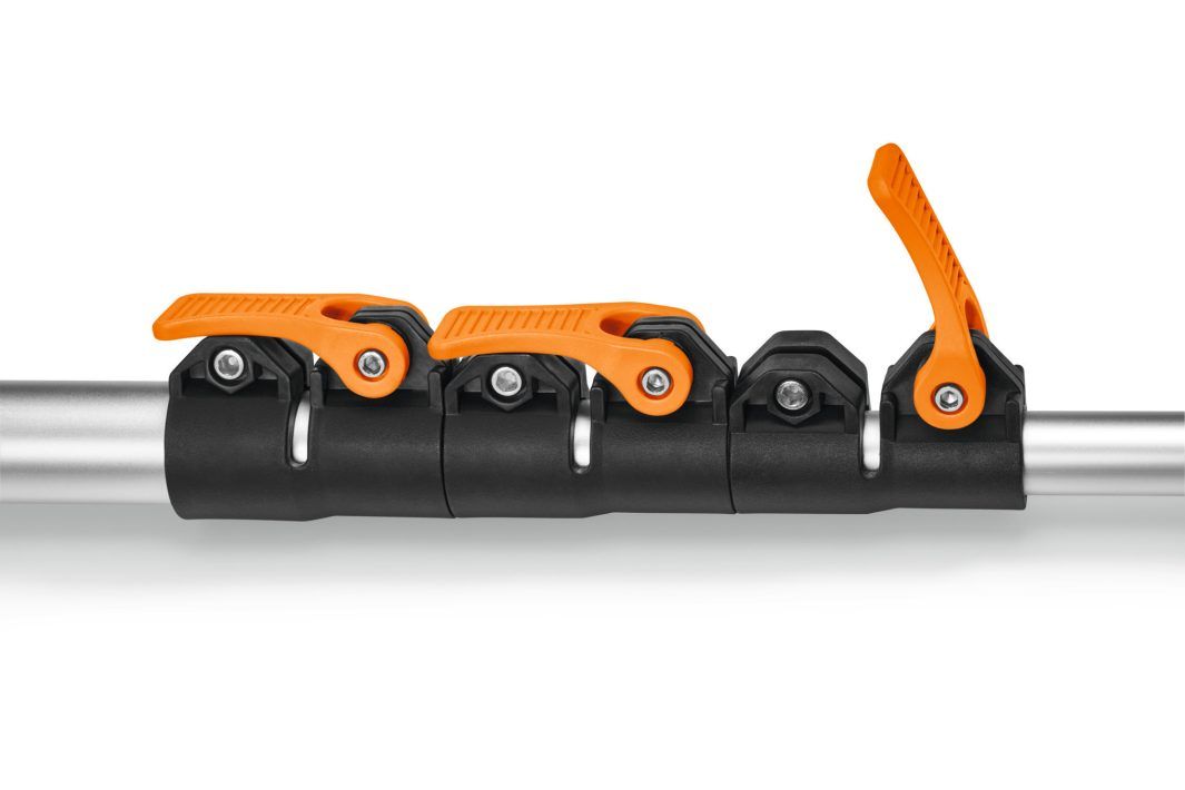 Integrovaná vysokotlaká pistole teleskopické tyče má rychlospojku pro snadné a rychlé připojení k vysokotlakému čističi. Kromě toho lze teleskopickou násadu snadno a rychle připojit k různým volitelným příslušenstvím vysokotlakých čističů STIHL pomocí bajonetové spojky, např. k čističi povrchů STIHL RA 110 nebo k mycímu kartáči STIHL. Kromě příslušenství přizpůsobeného příslušnému použití přispívá k nejlepším možným výsledkům čištění také nastavitelný pracovní úhel.