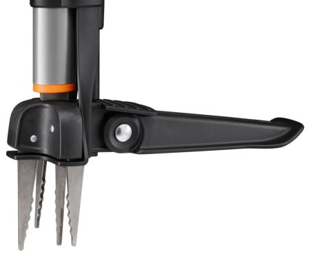 Sklopný pedál umožňuje snadné zapíchnutí nástroje do půdy bez nadměrné síly. Integrovaný otvor v pedálu slouží pro jednoduché zavěšení, díky čemuž vytrhávač nezabírá zbytečné místo při skladování v dílně nebo zahradním domku.